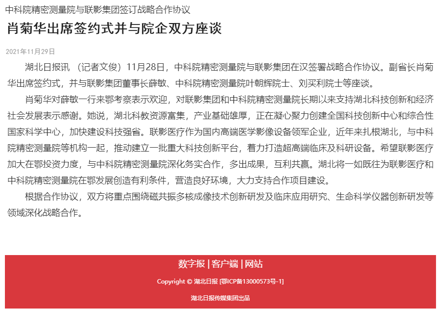 【湖北日报】中科院PA真人视讯与联影集团签订战略合作协议 肖菊华出席签约式并与院企双方座谈