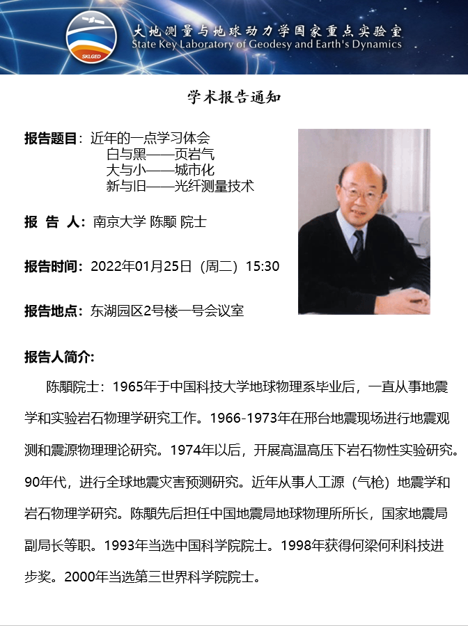 2022年1月25日PA真人视讯大地测量与地球动力学国家重点实验室学术预告