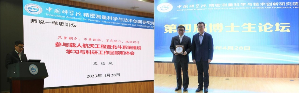 袁运斌做论坛特邀报告暨“师说·学思”讲坛《只争朝夕、不负韶华,不忘初心、砥砺前行》,从自己青少年阶段的成长经历和大学期间的往事谈起,结合自己的读研经历、实践经验,给同学们提出了三点建议:一是要在年轻的时候为未来长远的开展而努力专心地学习;二是要对自己的人生阶段、社会地位和工作岗位都要有合适的定位;三是要干可持续的、有意义的、可开展的事情。特邀报告结束后,洪成浩为袁运斌颁发“师说·学思”讲坛纪念牌。