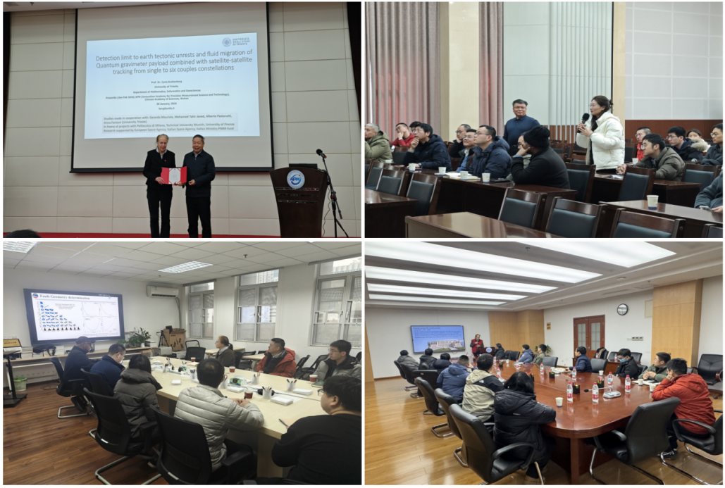 1月28日,孙和平院士为Carla Braitenberg颁发了PIFI证书。随后,Carla Braitenberg作了题为“Detection limit to earth tectonic unrests and fluid migration of Quantum gravimeter payload combined with satellite-satellite tracking from single to six couples constellations”的报告,系统阐述了全球重力卫星观测现状与未来规划,指出欧空局针对重力卫星已部署多项太空计划,产生的科技创新将使卫星重力观测技术迎来重大变革,有望实现比当前GRACE-FO标准更高的时间与空间分辨率,将会进一步拓展地球科学多个领域的研究和应用,并以三个重要应用(包括地震事件、海山形成过程、垂直地形变化)为例展开说明了未来量子重力卫星的应用前景。报告指出,未来的双星星座重力卫星较现在的单星星座在灵敏度上有出显著提升,说明星座配置对充分发挥量子重力卫星的性能优势至关重要。例如:灵敏度提升后的重力卫星能在一周采样间隔内探测到M8.6级地震产生的重力场变化,并且在地震发生之前就能观测到这些变化,未来可能利用卫星重力观测实现大地震预测。报告引发了与会者的热烈讨论。